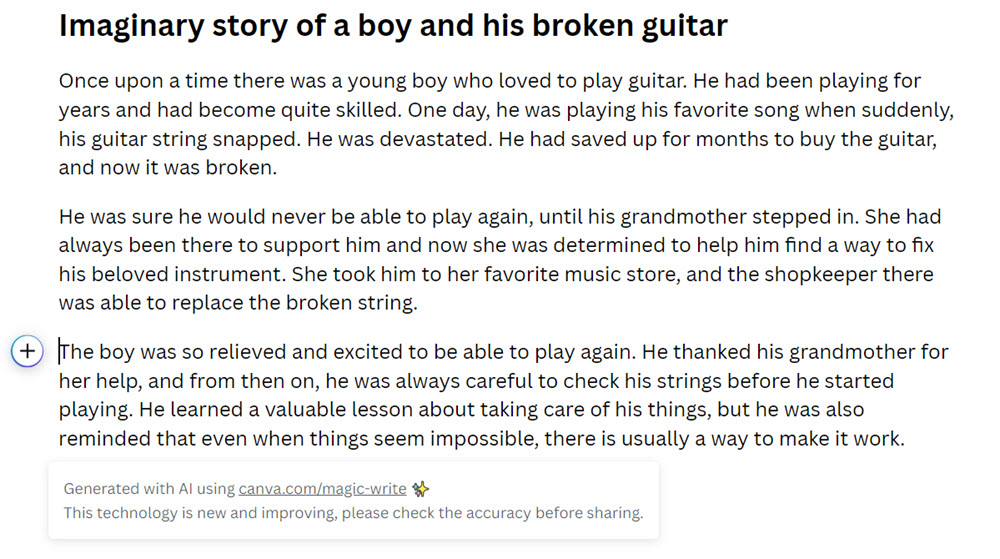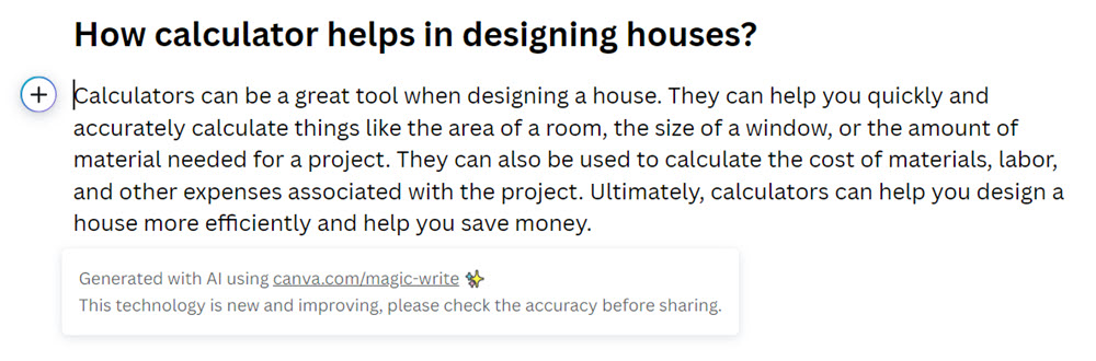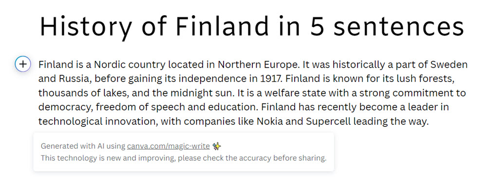 Canvalla on palvelussaan myös vastaavanlainen AI-tekstityökalu. Magic Write on mukana uudessa beta-julkaisuvaiheessa olevassa Docs-moduulissa. Docsin avulla voi tehdä Canvassa monipuolisia tekstidokumentteja, jotka sisältävät Canvan muita elementtejä (kaavioita, grafiikkaa, videota, upotuksia ym.). Taikakirjoitus ei toimi vielä suomenkielellä, mutta jos vaihdat Canvan kielen englanniksi, pääset hämmästelemään sen verbaalista lahjakkuutta. Tässä muutama esimerkki Magic Writen tuottamista lyhyistä tekstipätkistä. Tekoälylle annetaan kysymys tai lyhyt johdanto, josta se itse muodostaa tekstiä todella hienosti: